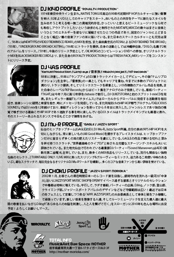 ◎DJ Mu-R(GAGLE / JAZZY SPORT/FLAT4) 仙台のヒップホップチーム[GAGLE]のDJ、DJ Mu-R。Jazzy Sport所属。自分の原点(90’S HIP HOP)を大切にしながらも、常に新しいもの(All Good Music)を提示するプレイスタイルは、ヒップホップファンだけに留まらず多くの耳の肥えたリスナーを虜にしている。GAGLEの作品で聞ける切れと深みを併せ持つスクラッチ、“世界最高峰のライブDJ”と称される完璧なステージング・スキルも大いに評価されている。 また地元仙台で行われている最重要DJパーティー『Sound Maneuvers』@ADD (偶数月第二金曜)も主宰している。また、数多くのMIX作品もリリースしている。流行も関係ない独特な曲のセレクト、2 TURNTABLE ONLY / LIVE MIXに拘ったスリリング&グルーヴィーなミックス、迫力ある二枚使い&味のあるいぶし銀なスクラッチで、毎回完全なるオリジナルDJ Mu-Rワールドを構築し、多くのコアな音楽ファンから高い評価を受けている。http://www.gagle.jp/