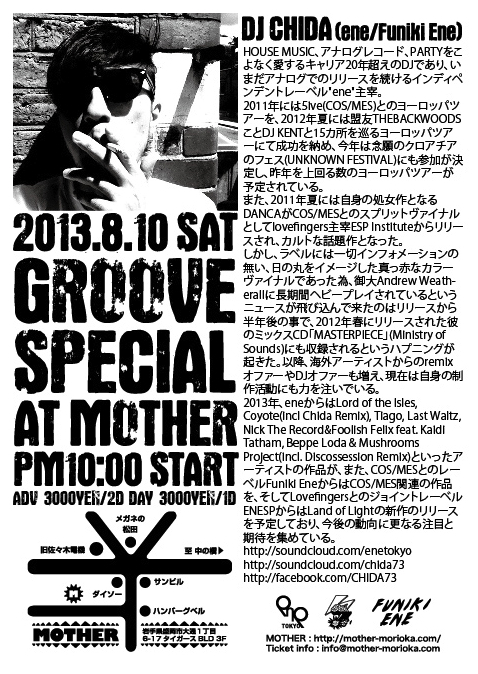 毎月一レギュラー、MOTHER前身ex DJBARDAIの頃より長く継続のパーティGROOVEがSUMMER SPECIALを開催。今回は日本人でありながらWORLD WIDEに活動するDJ CHIDA/ENEをMOTHERに初招待。