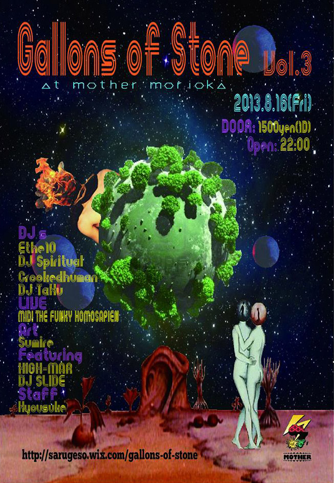2013.8.16 FRI『GALLONE OF STONE VOL3』PM10:00-AM4:00の詳細は専用HP、FACEBOOK PAGEにも随時更新されています。次世代ネクストジェネレーションなFRESH OUT PUT!!!!それはいつの間にか年を重ねてフッ….と忘れがちな何か『大切な物』を思い出させてくれる、そんな感動的パーティです。元々は高校生卒業パーティ(勿論、ノンスモ、ノンアルパーティ)がキッカケで出会った彼等。それぞれが新しい土地で新しい門出をし一年に何度か地元に戻ってリンクする彼等にとってとても大切な音楽コミュニュケートパーティ。音的にもだいぶ成長しててVOL2はVOL1より更に彼等より先輩の皆さんにも遊びに来て頂けました。新しい『芽』沢山あります。