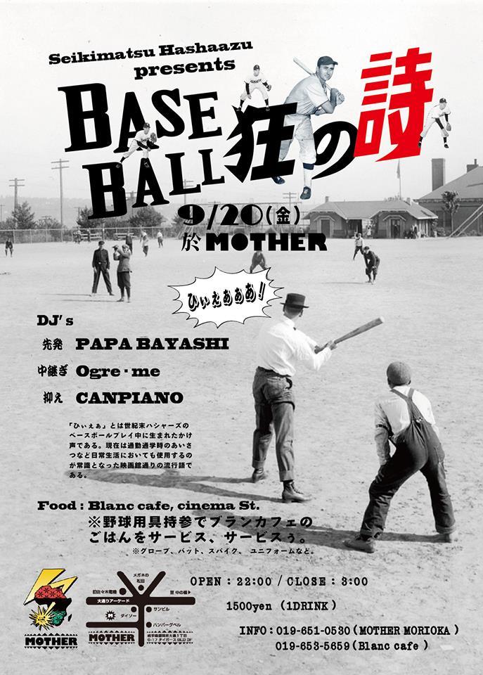 PM10:00-AM3:00盛岡市シネマストリート/Blanc Cafeさん率いる草野球チーム『SEIKIMATSU HASHAAZU PRESENTS VOL1』。野球がするのが好き、観るのが好き、なんとなくだけど好き…etc &音楽好き&遊び人なフランクなチーム。なんと当日は『何らかの野球用具持参』でBlanc Cafe FOODをサービスとの店主太っ腹STYLE!!!