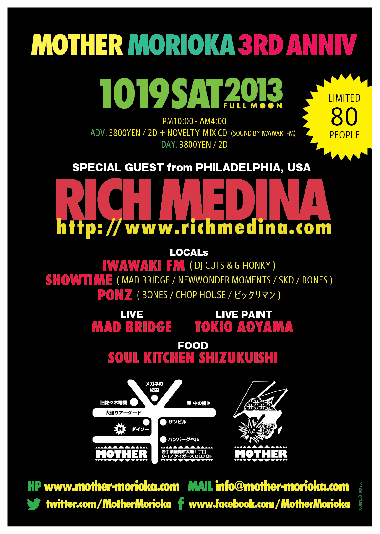 今回RICH MEDINAの今回の来日は日本で二カ所、その内一カ所が盛岡となります。(東北は盛岡一カ所です)アメリカ – 日本の渡航費もその二カ所で折半なので少しエントランス料金は通常より高めの設定になりますが関係者一同最高なパーティを御準備して御待ちしておりますので何卒御了承頂ければ幸いです。