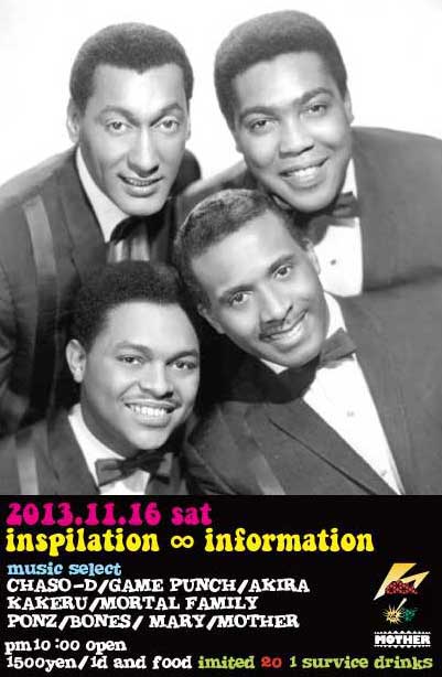 11/16土曜日は突発的に行う地元の楽しい場所には必ず出没な遊び人メンバーで開催の『Inspilation ∞ Informatio = 目に見えない情報』です。地元で活動するバンドMORTAL FAMILYのKAKERUくんもこの日は大好きなレコードを沢山持って遊びに来てくれるそうで楽しみです。