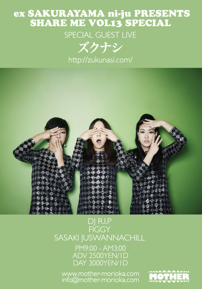 今回のSHARE MEも大成功、チョー盛上りました!来月、2014.8.8. SAT はスペシャルで『ズクナシ』が登場です。http://zukunasi.com/ フライヤーに日程入れるの忘れてしまった。。。のでR。。。詳細また追って。皆さんおつかれさまでした〜◎
