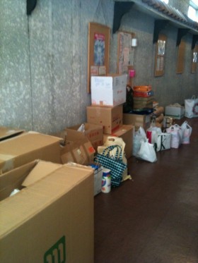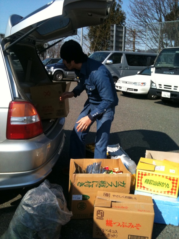exDJBARDAI、MOTHERでもフライヤーアートなどでお世話になってる奥州の仲間JAZZRIZEの事務所。ここで東京部隊、元渋谷レコードショップ『Sounds of Blackness』の関さん、カッチナスティ/JAZZYSPORTと合流。奥州で集まった荷物を更に皆で順に詰め込んだ。一台の大きなバンとTOKIO ARTの大きめな普通車は二台共物資でパンパンになった。エンジン音が若干重みで変わる程の物資を乗せ男性4名、女性自分を含め2名(ピスト乗りの女性友人アサミちゃん)で一路陸前高田市へ。