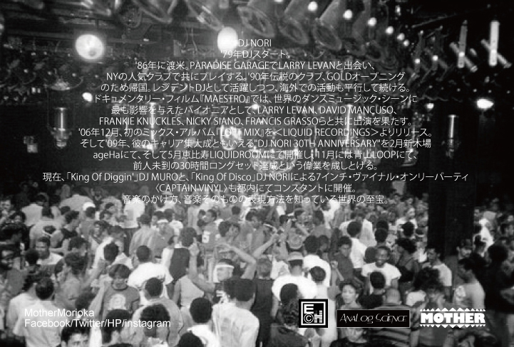連休前に7/25 SAT来盛 AT MOTHER GUEST DJ NORIさんのインタビューをアップしたら初のシェア数『21』という記録に驚きと感動。皆様ありがとうございます。今回のパーティタイトルは『LOVE IS THE MESSAGE』MFSBの名曲から頂きました。選曲、MIX、出音、UREI(DJ MIXER)の使い方、何一つとっても毎回刺激的で最終『感動と思い出』を残してくれるノリさん。いよいよ今週末来盛です。ジャンル、年齢、性別、国 籍….etc….を越え、はたまた近年増え続けるPC DJの皆様にも『ザ☆アナログ』を感じて頂く良い機会でもあるかと思います。80sの貴重なNY在住暦、PARADISE GARAGEでのDJ界の神、故LARRY LEVANとの共演暦、屈指のVINYLコレクターでもあるノリさん。ぜひ全音楽ファン皆様にオススメさせてください。(合わせてまだ拝見無い方には 70s 〜 NY DANCE MUSICシーンの貴重な記録 / MAESTRO(DVD)をいつか見て頂ければより深くシーンに付いて御理解頂けるかと思います)