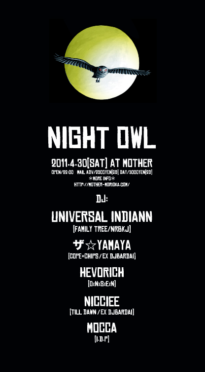 DJ UNIVERSAL INDIANN/Family Tree、濡れ牧場 http://universalindiann.blogspot.com/ niccie/FROM ex DJBARDAI.GUNMA AND ザ☆ yamaya/COPE&CHIPS.ex DJBARDAI、HEVORICH/O×N×S×E×N ♨、MOCCA/I.D.P 、lighting MASARU/I.D.P PM10:00 OPEN MAIL ADV 2500YEN/2D DAY 3000YEN/2D (前売チケットは当日午後8時までMOTHER HPコンタクトフォームより予約可能。前売チケット予約先着50名様にNIGHT OWL特製ノベルティバッジプレゼント)