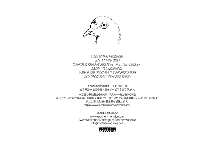 2017.3.11 SAT LOVE IS THE MESSAGE(DJ NORI × 長谷川賢治)FROM Tree / Gallery